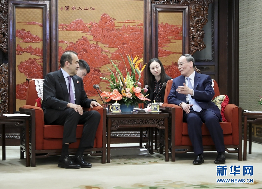 4月8日,國家副主席王岐山在北京中南海紫光閣會見哈薩克斯坦國家安全委員會主席馬西莫夫。 新華社記者丁海濤攝