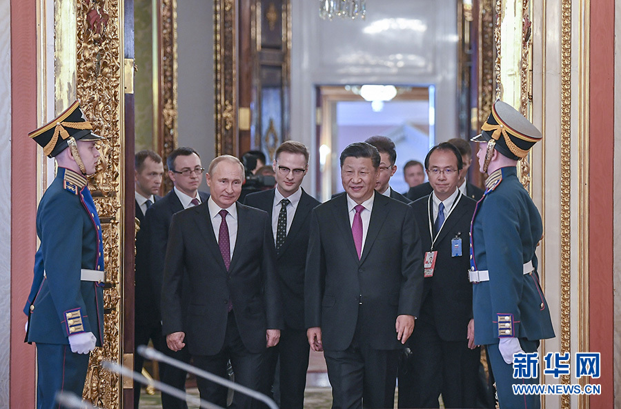 6月5日,國家主席習(xí)近平在莫斯科克里姆林宮同俄羅斯總統(tǒng)普京會談。這是兩國元首步入會場。 新華社記者 謝環(huán)馳 攝