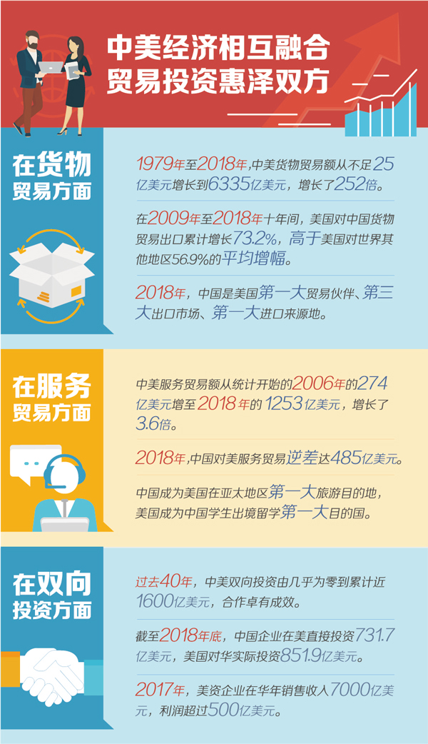 在國際經(jīng)濟(jì)合作中,正常的貿(mào)易關(guān)系是建立在等價(jià)交換基礎(chǔ)上的互惠互利關(guān)系,而不是你多我少、你輸我贏的“零和博弈”。國際貿(mào)易有利于推動(dòng)資源在世界范圍內(nèi)優(yōu)化配置,促進(jìn)各國經(jīng)濟(jì)共同發(fā)展,推動(dòng)人類社會(huì)共同進(jìn)步,國際貿(mào)易的歷史早已證明這樣的實(shí)踐是有效的,實(shí)踐經(jīng)驗(yàn)也早已成為國際經(jīng)濟(jì)學(xué)的基本原理,中美經(jīng)貿(mào)合作的事實(shí)也作了同樣的驗(yàn)證。中美建交以來,在雙邊貿(mào)易方面,1979年至2018年,雙邊貨物貿(mào)易額從不足25億美元增長到6335億美元,增長了252倍;在雙向投資領(lǐng)域,過去40年,中美雙向投資由幾乎為零到累計(jì)近1600億美元,中美互為對(duì)方重要投資伙伴,投資的雙向性和互惠性進(jìn)一步顯現(xiàn)。中美經(jīng)貿(mào)關(guān)系發(fā)展的歷程證明,中美通過優(yōu)勢互補(bǔ)、互通有無,有力促進(jìn)了各自經(jīng)濟(jì)發(fā)展和產(chǎn)業(yè)結(jié)構(gòu)優(yōu)化升級(jí),雙方經(jīng)貿(mào)往來是惠澤彼此的關(guān)系,而非中國讓美國“吃虧”的過程。