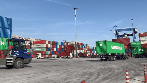 一輛輛集裝箱式半掛車、碼頭叉車穿梭往來,有條不紊地裝卸貨物?,F(xiàn)代化的比雷埃夫斯集裝箱碼頭繁忙有序。