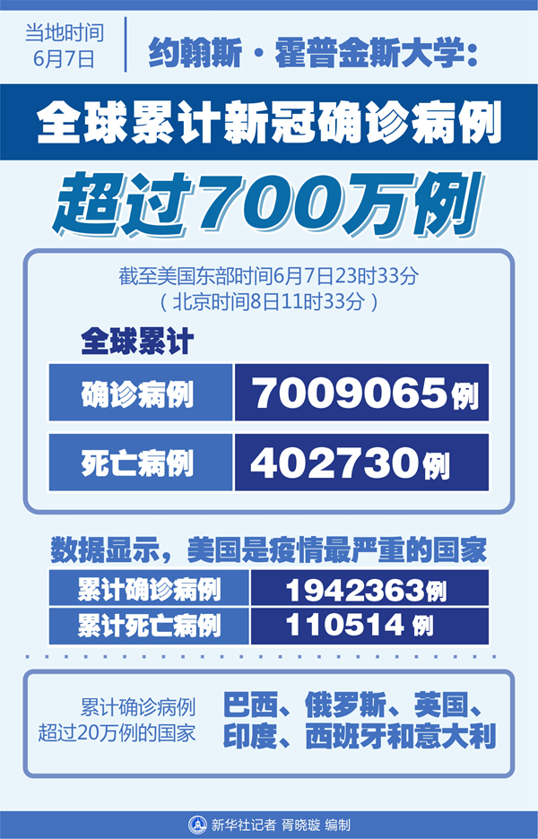 新華社紐約6月7日電 美國約翰斯·霍普金斯大學(xué)7日發(fā)布的新冠疫情統(tǒng)計數(shù)據(jù)顯示,截至美國東部時間7日23時33分(北京時間8日11時33分),全球累計確診病例達到7009065例,死亡病例為402730例。
