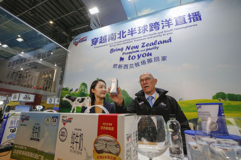 11月7日,羅伊(右)在第三屆進(jìn)博會(huì)紐仕蘭乳業(yè)展臺(tái)直播帶貨。