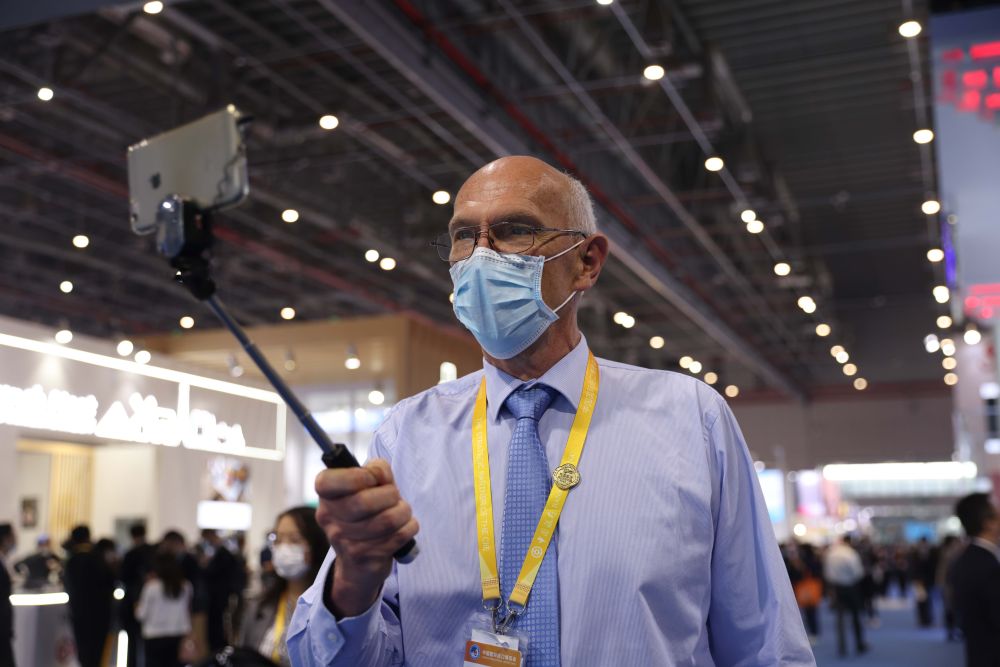 11月7日,羅伊在進(jìn)博會(huì)場(chǎng)館內(nèi)自拍留念。