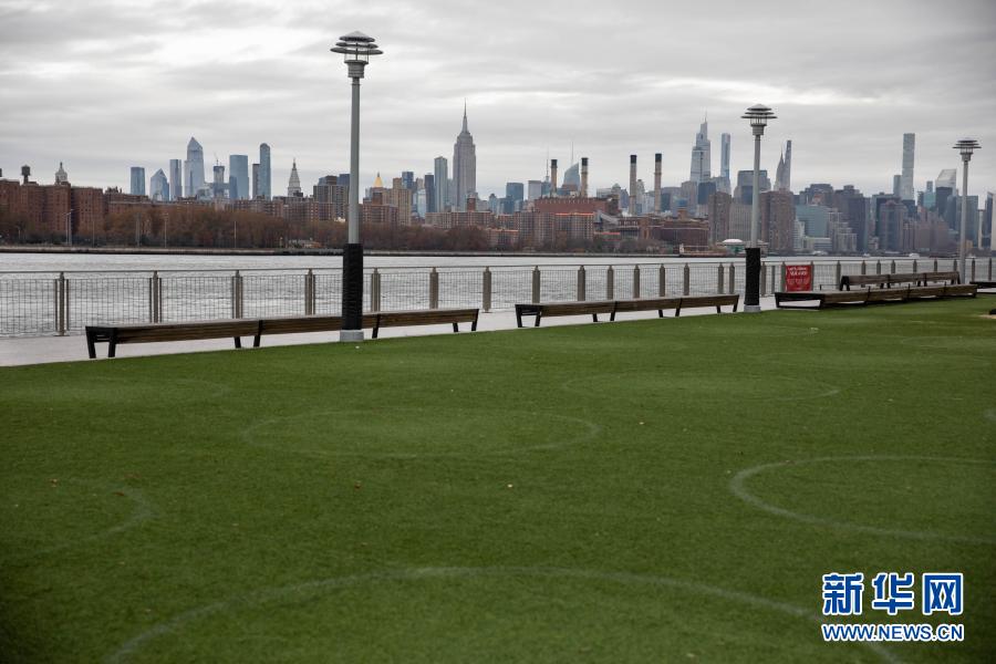 11月12日,在美國紐約多米諾公園,草坪上保持社交距離的圓圈清晰可見。新華社發(fā)(郭克攝)