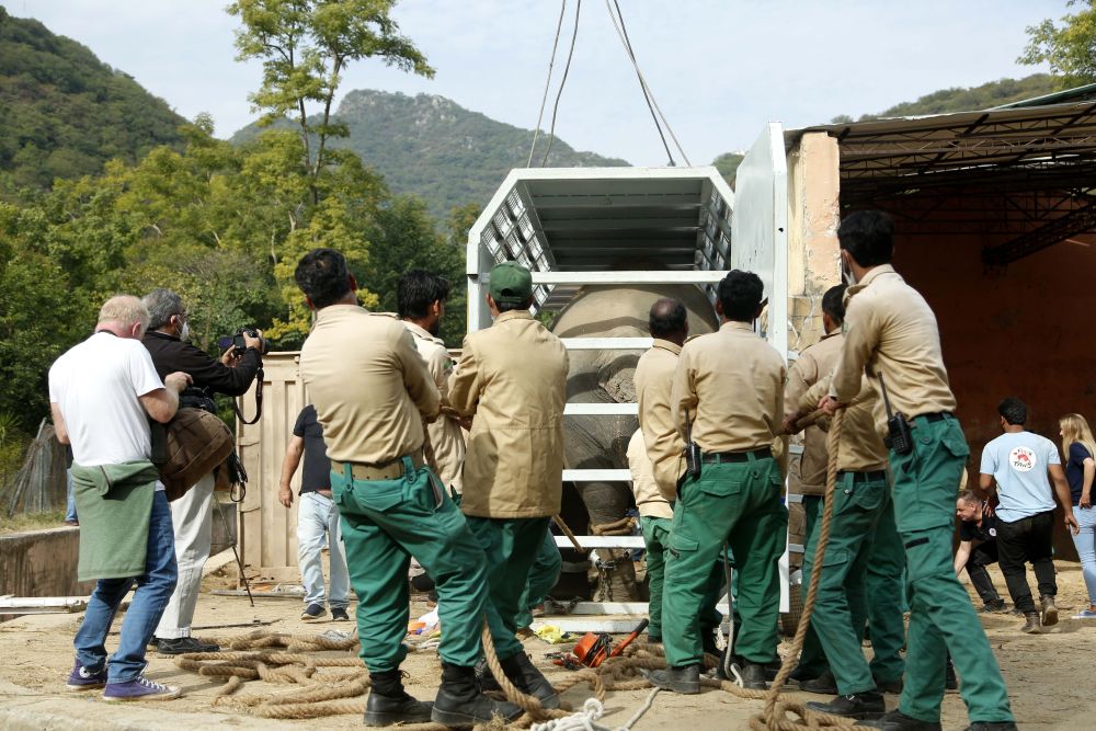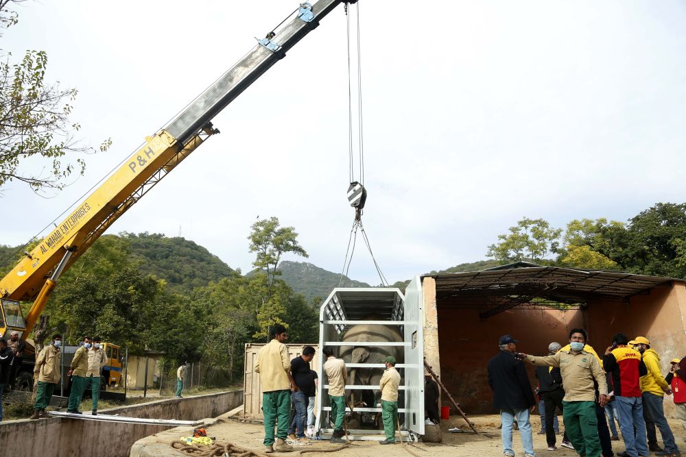 ↑11月29日,在巴基斯坦伊斯蘭堡,工作人員搬運裝有大象的運輸箱